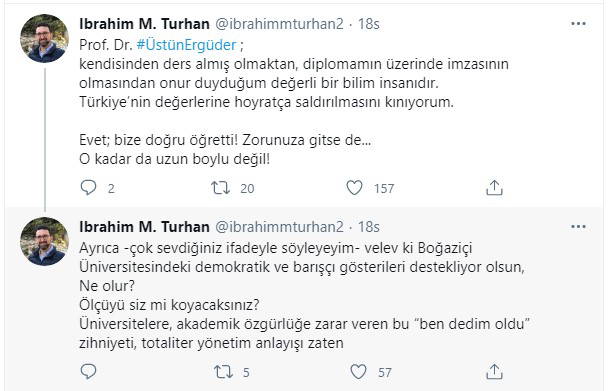 Gelecek Partisi Kurucular Kurulu Üyesi İbrahim Turhan da Twitter üzerinden Soylu’nun Prof. Ergüder'i uyarmasına şu sözlerle tepki gösterdi: