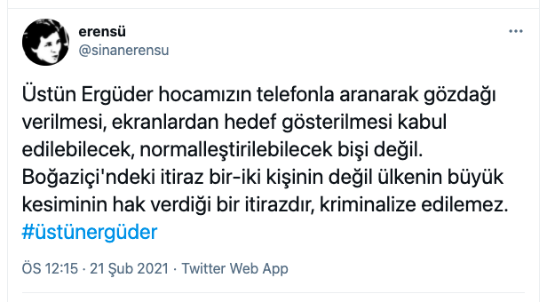 "Üstün Ergüder hocamızın telefonla aranarak gözdağı verilmesi, ekranlardan hedef gösterilmesi kabul edilebilecek, normalleştirilebilecek bir şey değil. Boğaziçi'ndeki itiraz bir-iki kişinin değil ülkenin büyük kesiminin hak verdiği bir itirazdır, kriminalize edilemez."