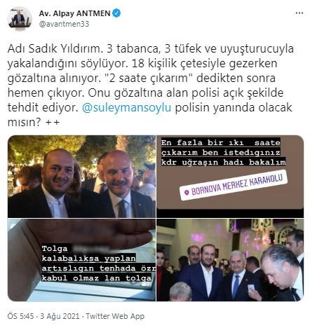 "Adı Sadık Yıldırım. 3 tabanca, 3 tüfek ve uyuşturucuyla yakalandığını söylüyor. 18 kişilik çetesiyle gezerken gözaltına alınıyor. "2 saate çıkarım" dedikten sonra hemen çıkıyor. Onu gözaltına alan polisi açık şekilde tehdit ediyor."