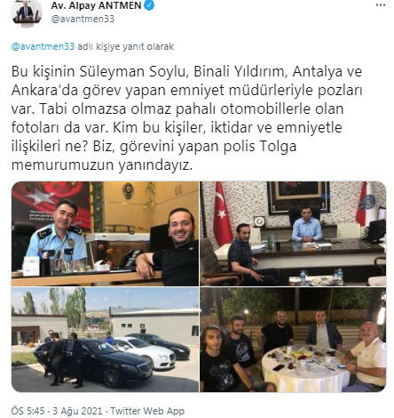 "Kim bu kişiler, iktidar ve emniyetle ilişkileri ne?" diye soran Antmen "Biz, görevini yapan polis Tolga memurumuzun yanındayız" ifadelerini kullandı.