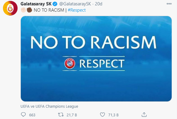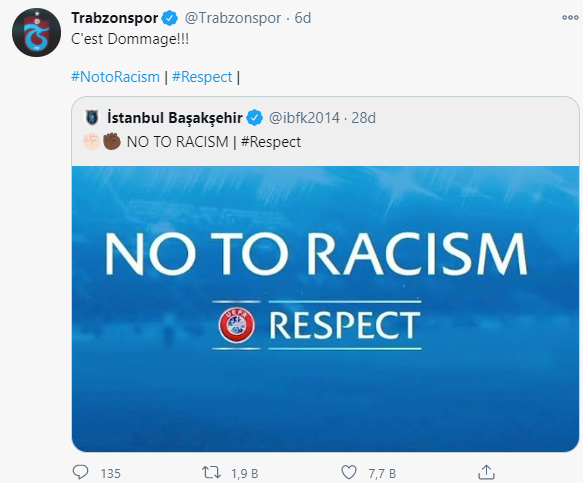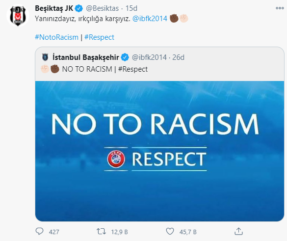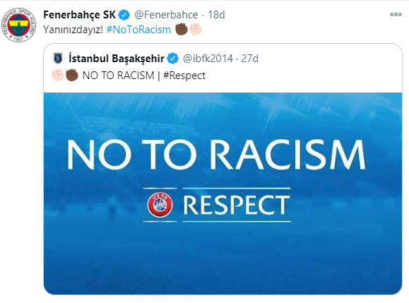 Irkçılık olayı sonrası Başakşehir'e büyük destek geldi. Fenerbahçe, Galatasaray, Beşiktaş, Trabzonspor, İBBSK gibi kulüpler ve futbolcular, CHP Genel Başkanı Kemal Kılıçdaroğlu, İBB Başkanı Ekrem İmamoğlu Başakşehir'in yanında olduklarını ifade eden tweetler attılar. İlerleyen saatlerde Cumhurbaşkanı Erdoğan'dan da destek mesajı geldi. Caner Erkin, Webo'nun fotoğrafını paylaşıp, "kardeşim.." mesajı verdi.