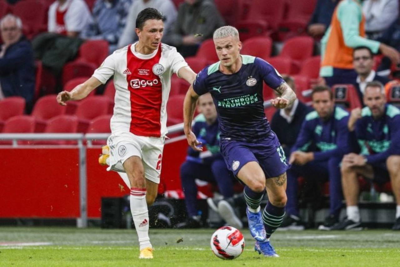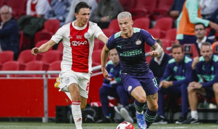 Steven Berghuis (solda), Cuma günü oynanan Johan Cruyff Kupası maçında PSV Eindhoven'dan Philipp Max'tan topu almaya çalışıyor