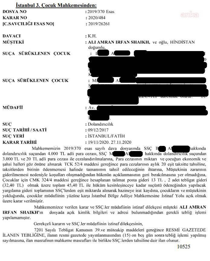 İstanbul 3. Çocuk Mahkemesi, suça sürüklenen çocuklar B.A. ve M.A.’nın isim ve soyisimlerini bugün Resmi Gazete’de yayımladı. Mahkemenin bugün yayımladığı ilanda, olay tarihinde 16 yaşında olan B.A. ve olay tarihinde 14 yaşında olan M.A.’nın dolandırıcılık suçundan yargılandığı duyuruldu. B.A.’ya 4 bin lira ve M.A.’ya ise 3 bin 20 lira para cezası verilmesine ilişkin mahkeme kararı ilan yoluyla sanıklara tebliğ edilmiş oldu.