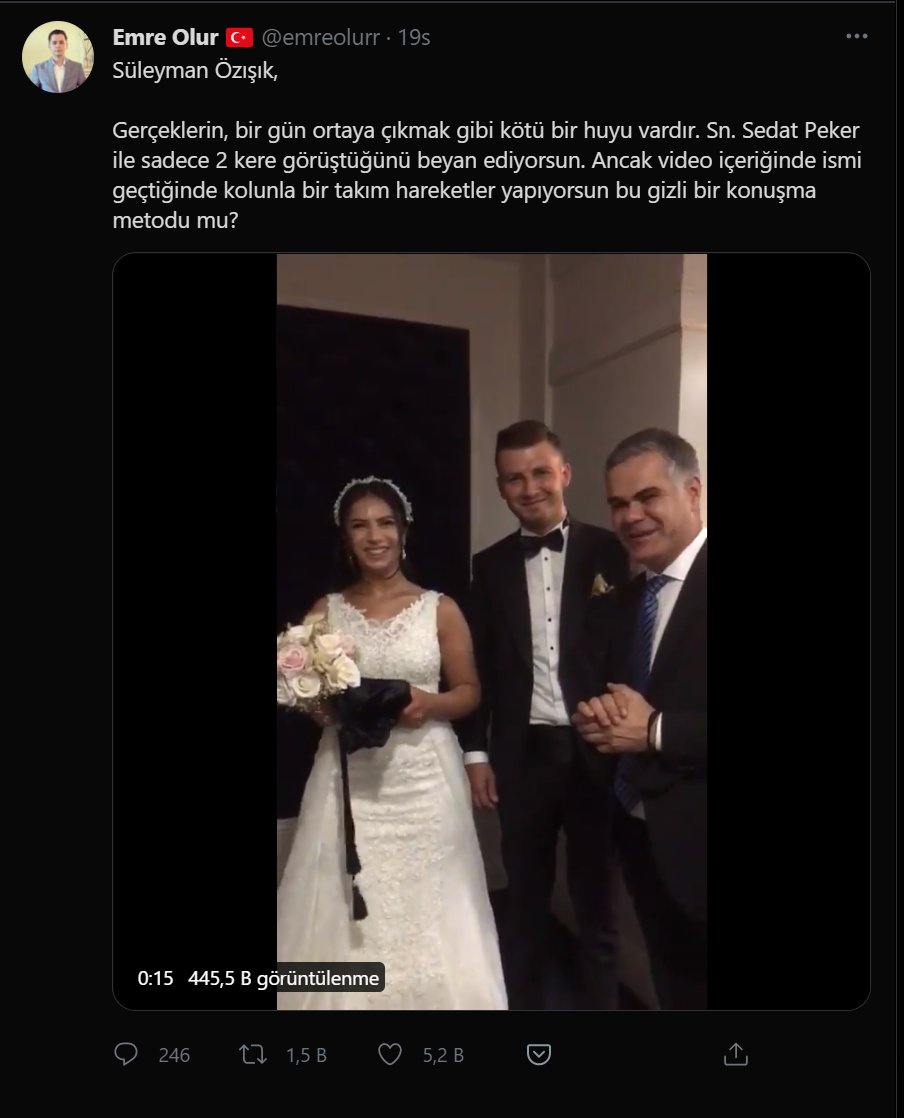 Organize suç örgütü lideri Sedat Peker ile İçişleri Bakanı Süleyman Soylu arasında arabuluculuk yaptıkları iddia edilen Özışık kardeşlerden Süleyman Özışık, geçen gün yaptığı açıklamanın ardından yeni bir video daha yayınlandı. Twitter'da Sedat Peker'e yakınlığıyla bilinen bir işi tarafından, Süleyman Özışık'ın oğlunun düğününe Sedat Peker'in hediye gönderdiğini gösteren bir video paylaşıldı. Videoda Özışık ve gelini, Peker'e teşekkür ediyor. Videoyu paylaşan kişi, hediyenin 80 bin TL değerinde olduğunu ifade etti.