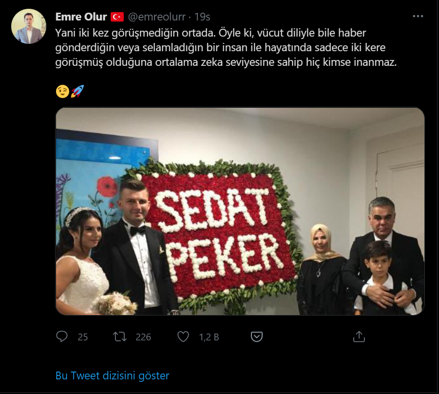 Ardından Özışık'ın Peker'le iki kez görüştüğünü söylemesine yanıt veren Olur, “2020’de düğününe 80 bin liralık mücevher ve çelenk gönderdi, neden kabul ettin?