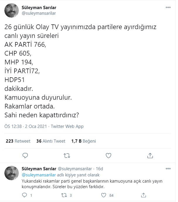 Siyasi partilerin canlı yayınlarına ayırdıkları süreleri paylaşan Olay TV Genel Yayın Yönetmeni Süleyman Sarılar, AKP'ye 766 dakika HDP'ye ise 51 dakika ayırdıklarını aktardı.