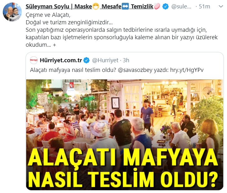 İçişleri Bakanı Süleyman Soylu, Hürriyet'te yayınlanan Savaş Özbey'in yazdığı "Alaçatı mafyaya nasıl teslim oldu?" başlıklı köşe yazısına sert tepki gösterdi.