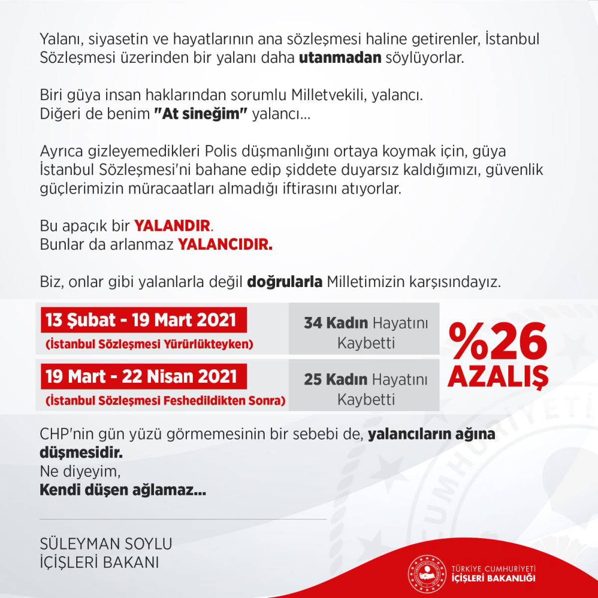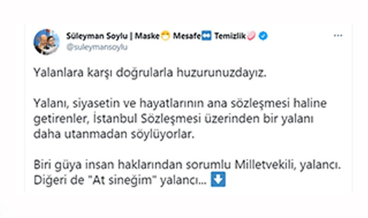 Süleyman Soylu, sosyal medya hesabından "Yalanı, siyasetin ve hayatlarının ana sözleşmesi haline getirenler, İstanbul Sözleşmesi üzerinden bir yalanı daha utanmadan söylüyorlar. Biri güya insan haklarından sorumlu Milletvekili, yalancı. Diğeri de "At sineğim" yalancı.." diye yazdı.