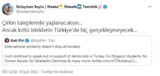 Paylaşımı alıntılayan İçişleri Bakanı Süleyman Soylu, Piri'ye “Çirkin taleplerinle yaşlanacaksın… Ancak kötü isteklerin Türkiye’de hiç gerçekleşmeyecek” yanıtını verdi.