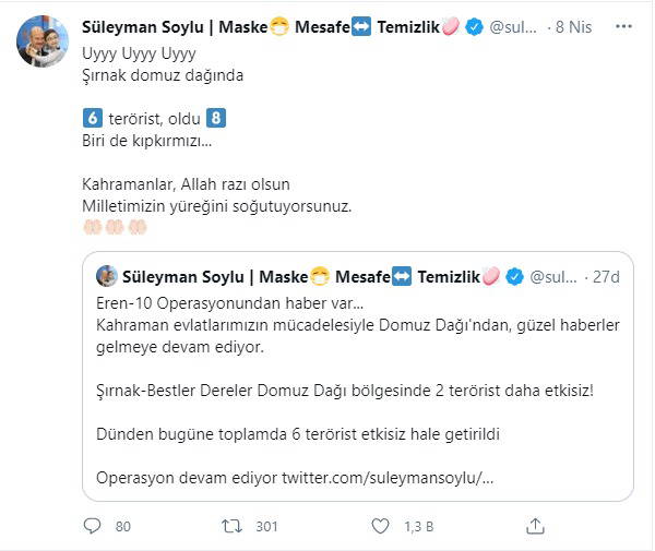 "Uyyy Uyyy Uyyy. Şırnak domuz dağında 6 terörist, oldu 8. Biri de kıpkırmızı... Kahramanlar, Allah razı olsun, milletimizin yüreğini soğutuyorsunuz."