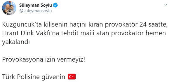 İçişleri Bakanı Süleyman Soylu, Twitter hesabından, "Kuzguncuk’ta kilisenin haçını kıran provokatör 24 saatte, Hrant Dink Vakfı’na tehdit maili atan provokatör hemen yakalandı. Provokasyona izin vermeyiz!" paylaşımında bulundu.