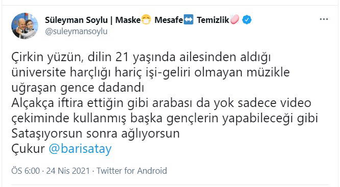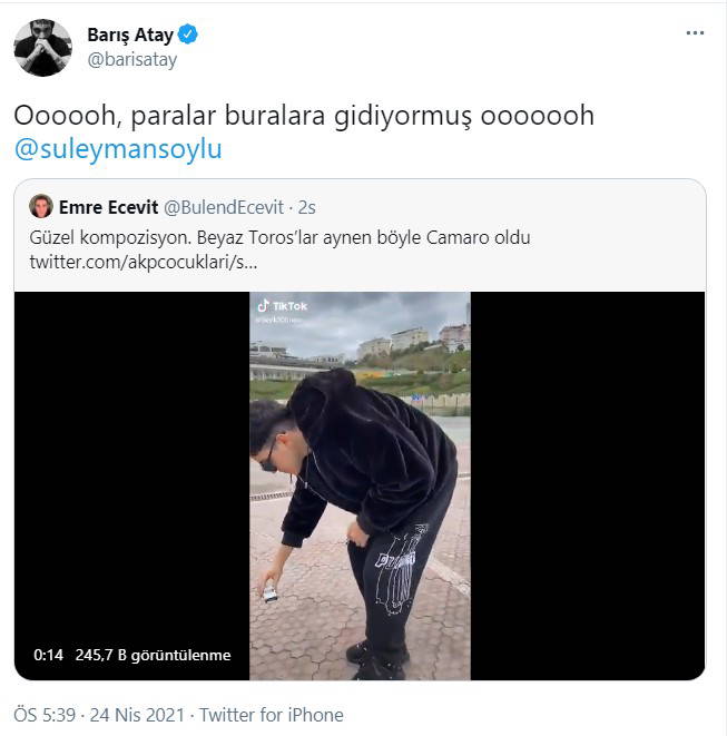 Sosyal medyada Süleyman Soylu'nun yeğeninin son model bir araba ile videosunun çıkmasına "Ohh paralar buralara gidiyormuş ooooooh" yazan ve Soylu'yu etiketleyen Barış Atay bir anda gündeme oturdu.