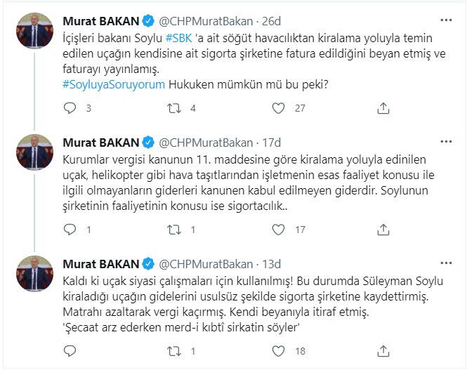 CHP İzmir Milletvekili Murat Bakan yaptığı açıklamada, "Süleyman Soylu kiraladığı uçağın giderlerini usulsüz şekilde sigorta şirketine kaydettirmiş. Matrahı azaltarak vergi kaçırmış" dedi.