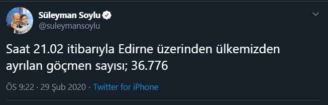 Soylu, "Saat 21.02 itibariyle Edirne üzerinden ülkemizden ayrılan göçmen sayısı, 36 bin 776" ifadelerini kullandı.