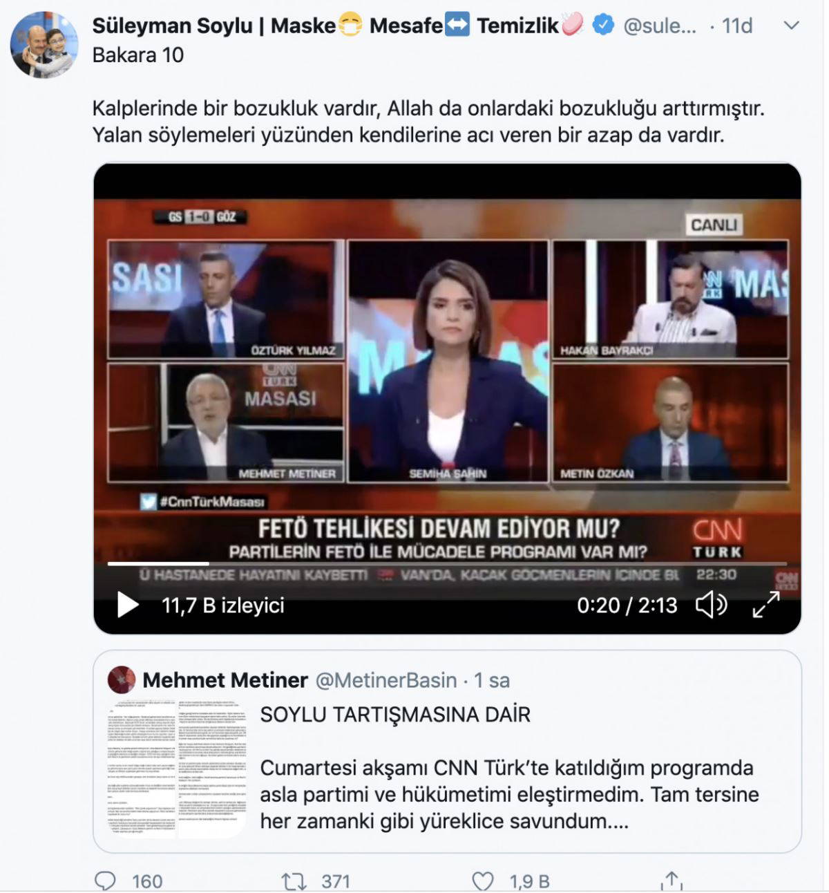 Soylu paylaşımında, "Bakara 10 Kalplerinde bir bozukluk vardır, Allah da onlardaki bozukluğu arttırmıştır. Yalan söylemeleri yüzünden kendilerine acı veren bir azap da vardır." ifadesini kullandı. Soylu CNN Türk canlı yayınındaki videosunu da paylaşımına ekledi.