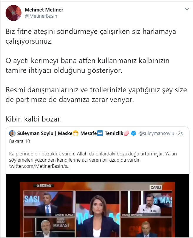 "Biz fitne ateşini söndürmeye çalışırken siz harlamaya çalışıyorsunuz. O ayeti kerimeyi bana atfen kullanmanız kalbinizin tamire ihtiyacı olduğunu gösteriyor. Trollerinizle yaptığınız şey size de partimize de zarar veriyor. Kibir kalbi bozar."