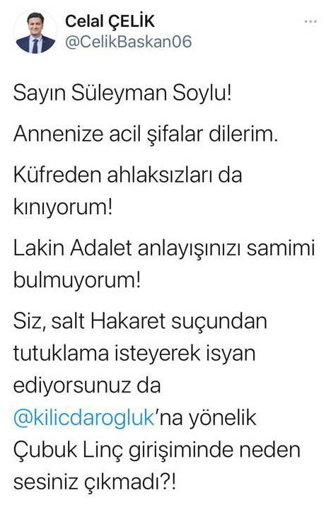 Soylu'nun sözlerine yanıt veren CHP'li Çelik, CHP Genel Başkanı Kemal Kılıçdaroğlu'nun Ankara Çubuk'ta katıldığı bir şehidin cenazesindeki linç girişimini hatırlattı. Soylu'nun ailesine yönelik küfürleri kınayan Çelik, "Sayın Süleyman Soylu, annenize acil şifalar dilerim. Küfreden ahlaksızları da kınıyorum! Lakin Adalet anlayışınızı samimi bulmuyorum! Siz, salt Hakaret suçundan tutuklama isteyerek isyan ediyorsunuz da Kılıçdaroğlu'na yönelik Çubuk Linç girişiminde neden sesiniz çıkmadı?" ifadelerini kullandı.