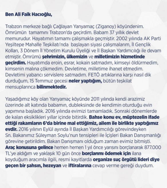 Hacıoğlu, sosyal medya hesabından yaptığı açıklamayla Peker'e yanıt verdi. Hacıoğlu "Ben Ali Faik Hacıoğlu, Hayatımda eroin, kokain satmadım, kimseyi öldürmedim, kimsenin malına çökmedim. Devletime, milletime ihanet etmedim. Devletimi yabancı servislere satmadım" ifadelerini kullandı. Söz konusu evin yapımını ailesiyle birlikte, İçişleri Bakanlığı danışmanlığına getirildiği 2016 yılında tamamladıklarını savunan Hacıoğlu, evin ifade edilen rakamın 6'da birine mal edildiğini öne sürdü. Bahse konu aracı ise "hemen hemen 1 yıl önce yarısını borçlanarak 877 bin TL'ye aldığını" söyleyen Hacıoğlu aracı bir süre önce "borçlarını ödemek için" satışa çıkardığını savundu.