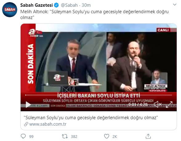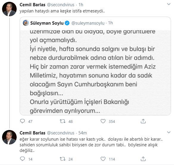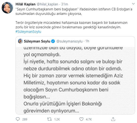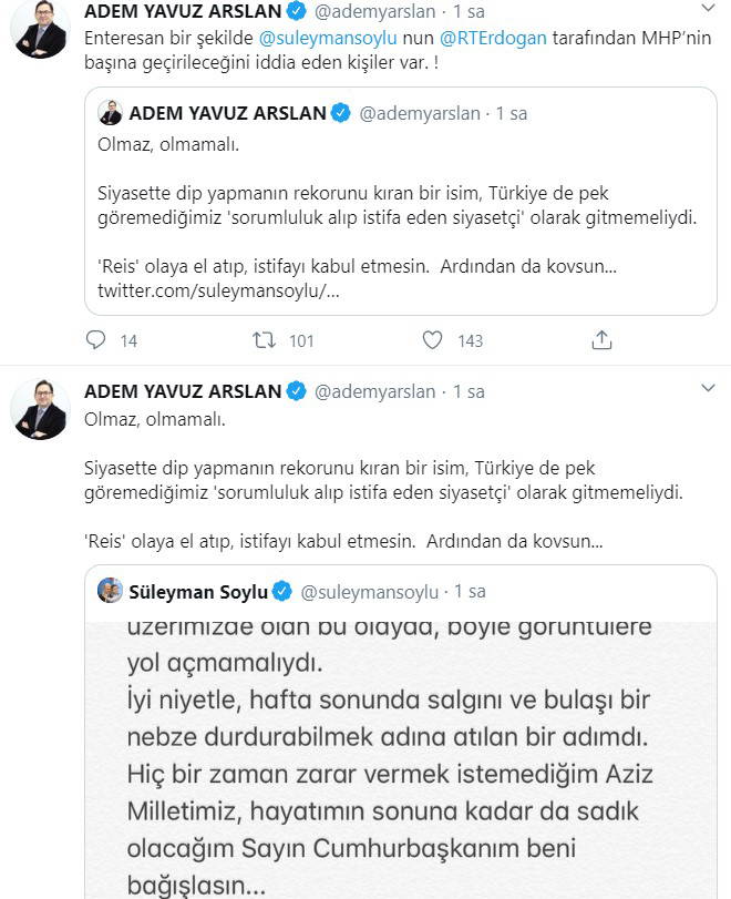 Bir başka FETÖ firarisi Adem Yavuz Arslan ise Soylu’nun istifası üzerine, “Olmaz, olmamalı. Siyasette dip yapmanın rekorunu kıran bir isim, Türkiye de pek göremediğimiz 'sorumluluk alıp istifa eden siyasetçi' olarak gitmemeliydi. 'Reis' olaya el atıp, istifayı kabul etmesin. Ardından da kovsun” ifadelerini kullandı. Arslan, Soylu'nun Cumhurbaşkanı Erdoğan tarafında MHP'nin başına getirileceği iddialarının olduğunu belirtti.