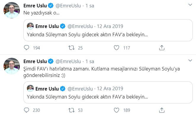 FETÖ firarisi Emrullah Uslu, Süleyman Soylu’nun istifasını, 12 Aralık 2019’da yaptığı paylaşımla duyurdu. “Yakında Süleyman Soylu gidecek aktın FAV’a bekleyin...” ifadelerini paylaşan Uslu, “Şimdi FAV’ı hatırlatma zamanı. Kutlama mesajlarınızı Süleyman Soylu’ya gönderebilirsiniz” açıklamasında bulundu.