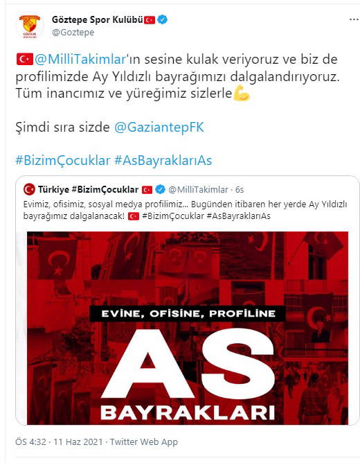 2020 Avrupa Futbol Şampiyonası’nın açılış maçında bugün Roma’da İtalya ile karşı karşıya gelecek olan A Milli Futbol Takımı'na bir destek de Süper Lig ekiplerinden geldi. Milli Takımlar resmi sosyal medya hesabının “Evimiz, ofisimiz, sosyal medya profilimiz... Bugünden itibaren her yerde Ay Yıldızlı bayrağımız dalgalanacak!” paylaşımına ilk olarak Göztepe cevap verdi. “@MilliTakimlar'ın sesine kulak veriyoruz ve biz de profilimizde Ay Yıldızlı bayrağımızı dalgalandırıyoruz. Tüm inancımız ve yüreğimiz sizlerle” diyerek Gaziantep FK’yı etiketledi. Daha sonra ise bu akıma Fenerbahçe, Kasımpaşa, Çaykur Rizespor, Adana Demirspor, Beşiktaş destek verdi.