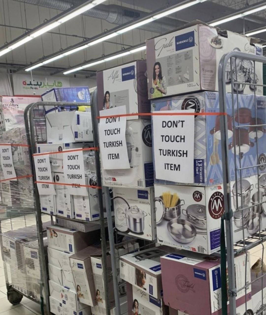 Market bu alanı alışverişe kapatarak "Türk markalarına dokunmayın" yazılı kağıtlar yapıştırdı. Müşterilerini Türk mallarını almamak üzere uyaran marketin fotoğrafları tepki yarattı.