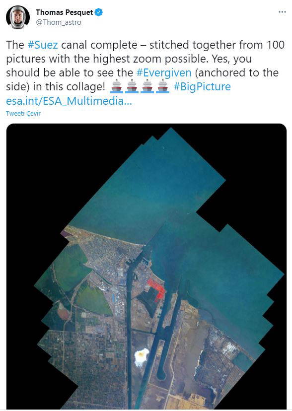 Pesquet, görselle birlikte paylaştığı mesajında “Süveyş Kanalı, mümkün olan en yüksek yakınlaştırma ile 100 fotoğraftan bir araya getirilmiş şekilde tamamlandı. Evet, bu kolajda Evergiven'i (yana demirli) görebilirsiniz!” dedi. Evergiven adlı yük gemisi, 24 Mart’ta karaya oturmuş ve kanal trafiğini tıkayarak uzun gemi kuyrukları oluşturmuştu.