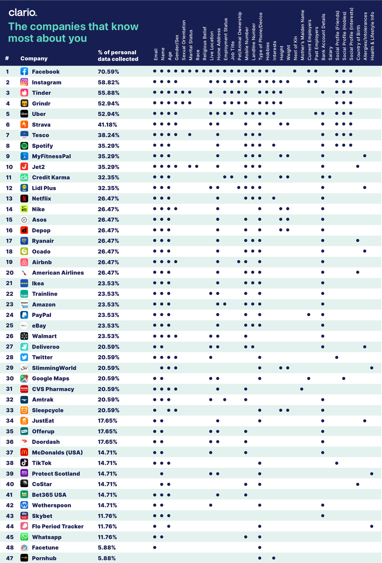 Dijital güvenlik teknolojisi platformu Clario.co, hangi şirket ve uygulamanın kullanıcılar hakkında hangi bilgileri topladığını gösteren bir grafik hazırladı.