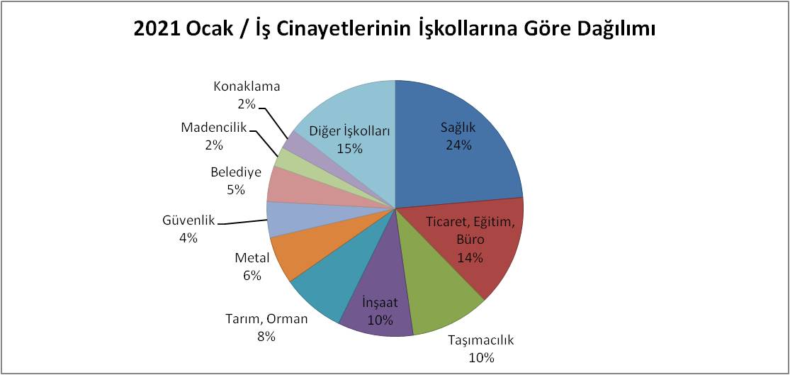-İş cinayetleri en çok ağlık, ticaret/eğitim/büro, taşımacılık, inşaat, tarım, metal, güvenlik, belediye, madencilik ve konaklama işkollarında gerçekleşti.
