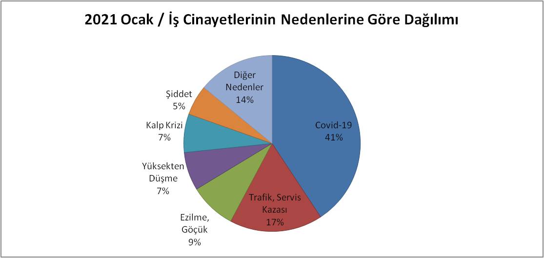 -En fazla ölüm nedenleri sırasıyla Covid-19, trafik/servis kazası, ezilme/göçük, yüksekten düşme, kalp krizi, şiddet, zehirlenme/boğulma, intihar ve elektrik çarpması.