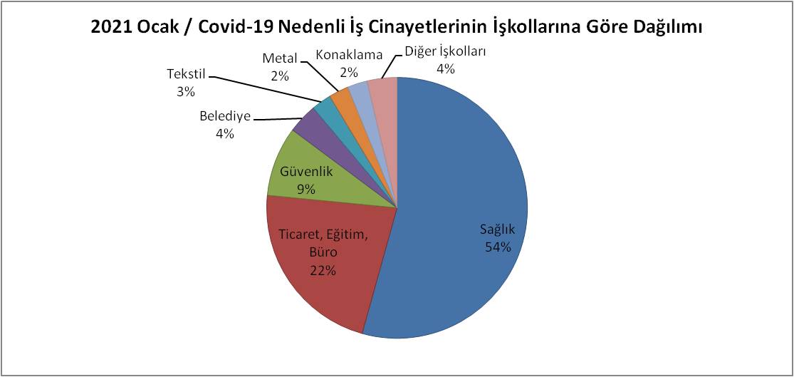 Covid-19 nedenli ölümler sırasıyla sağlık, ticaret/eğitim/büro, güvenlik, belediye, tekstil, metal, konaklama, kimya, banka ve taşımacılık işkollarında meydana geldi.