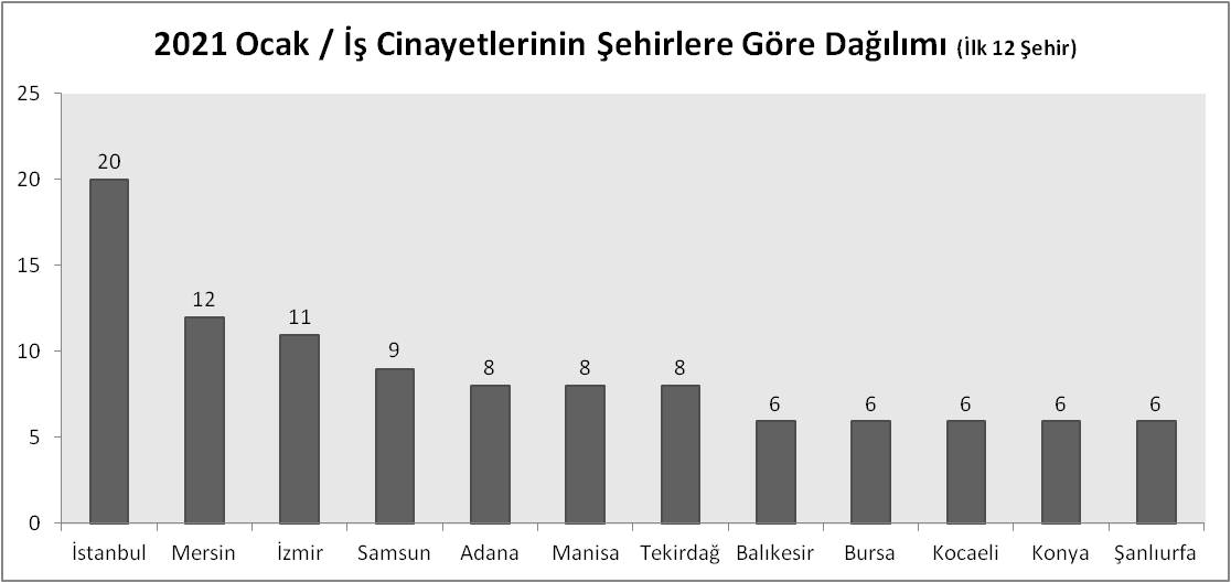 -En çok iş cinayeti 20 ölüm ile İstanbul’da yaşandı. İstanbul’u sırasıyla Mersin, İzmir, Samsun, Adana, Manisa ve Tekirdağ izledi.