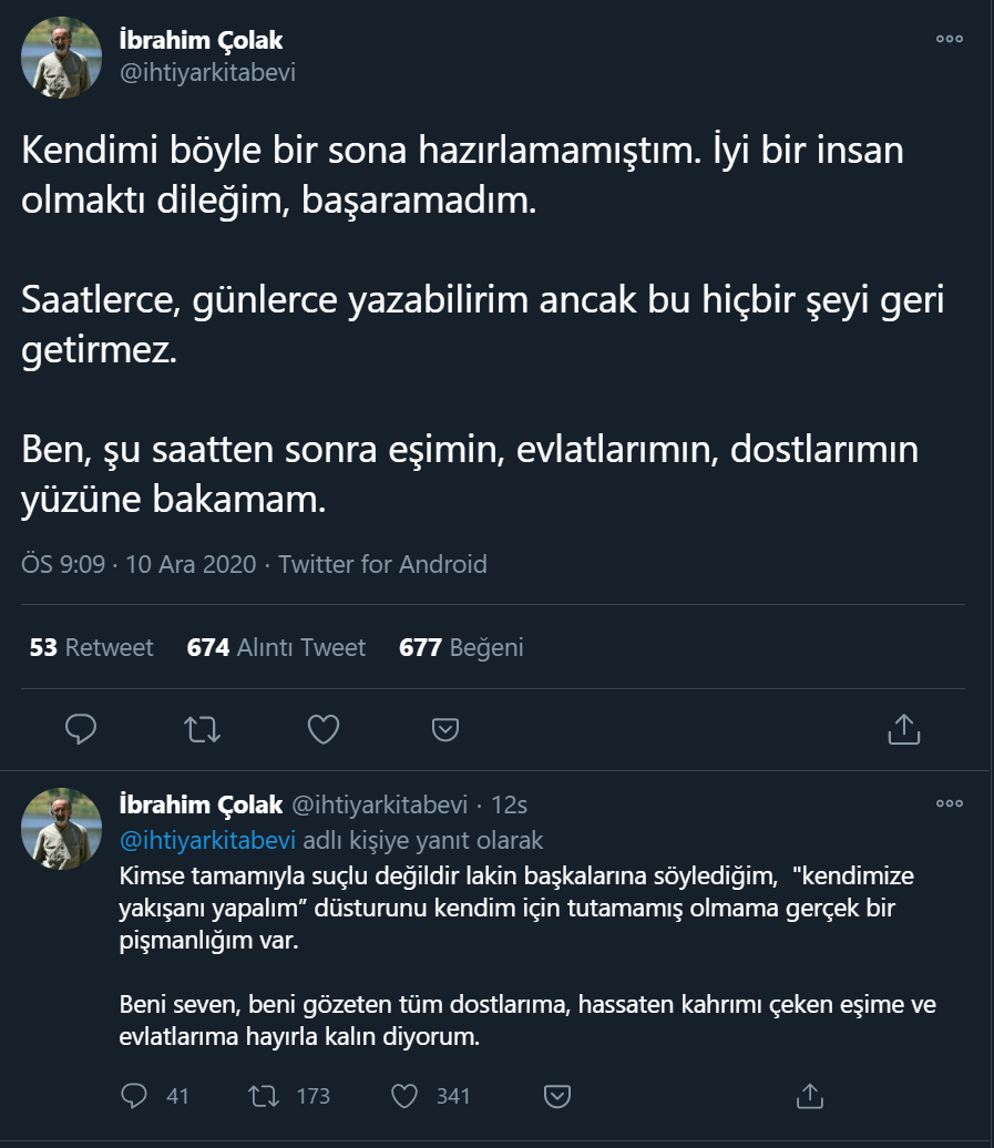 İddiaları doğrulayan Yeni Şafak gazetesi yazarı İsmail Kılıçarslan, Twitter paylaşımında “İbrahim Çolak intihar ederek son verdi hayatına. Ne diyeyim, ne yazayım bilmiyorum. Bildiğim tek şey intiharın hiçbir şart altında çözüm ve uygun son olmadığı... Çok üzgünüm” ifadelerine yer verdi.