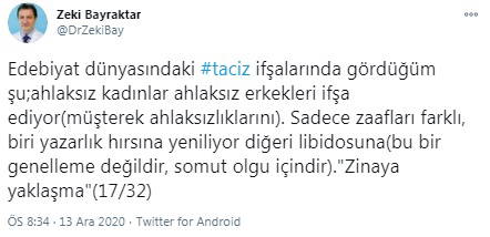 Medipol Üniversitesi Tıp Fakültesi Öğretim Üyesi Ürolog Prof. Zeki Bayraktar, Twitter hesabından paylaştığı yorumunda, tacizlerin teşhir edilmesi "ahlaksız kadınlar ahlaksız erkekleri ifşa ediyor" dedi.