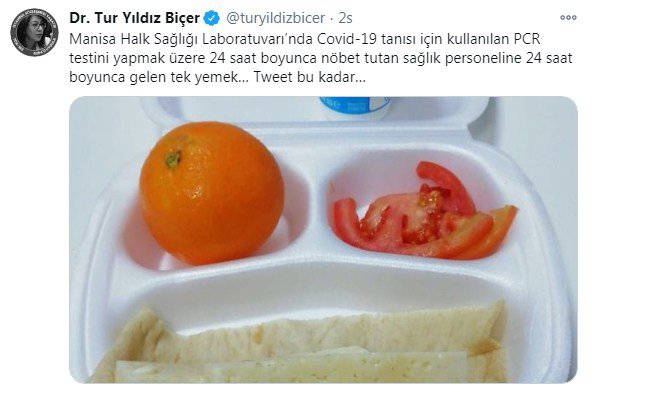 CHP’nin eski Manisa Milletvekili Doktor Tur Yıldız Biçer, Twitter hesabından 24 saat görev yapan PCR testi yapan bölümdeki sağlıkçılara verilen domates, peynir, lavaş ve ayrandan oluşan yemeği paylaştı.