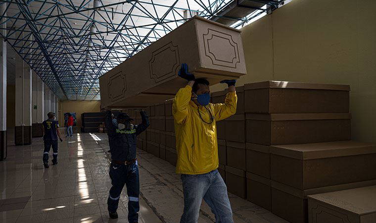 Orta Amerika ülkesi Ekvador'da yeni tip koronavirüs (Covid-19) salgını kaynaklı ölümlerden dolayı artık morglar yetmiyor. Yaşamını yitirenler soğutuculu konteynerlere konuluyor. Tahta yetmediği için kartondan tabutlar kullanılıyor.