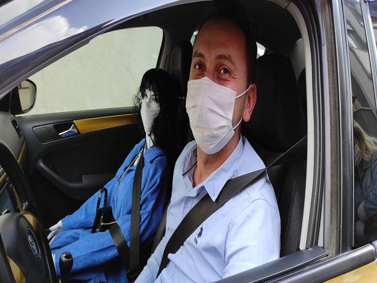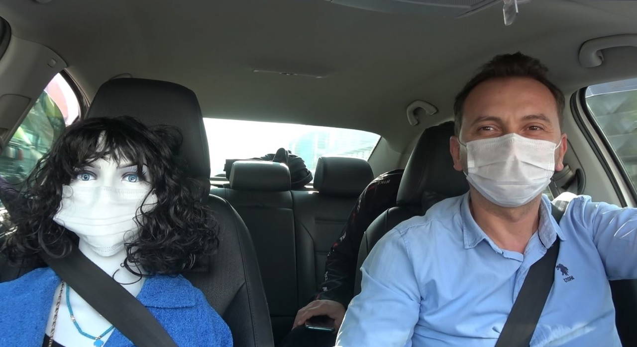 Düzce’de taksicilik yapan Hakan Atılgan havaların soğuması ile birlikte artış gösteren koronavirüs vakalarına karşı hem kendisini hem de müşterilerini korumak için kendince tedbir aldı. Atılgan, sosyal mesafenin korunması amacıyla taksinin ön koltuğuna oturulmasını engellemek için cansız manken taşımaya başladı.