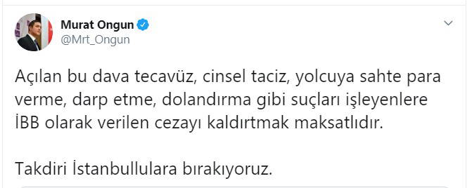 "Açılan bu dava tecavüz, cinsel taciz, yolcuya sahte para verme, darp etme, dolandırma gibi suçları işleyenlere İBB olarak verilen cezayı kaldırtmak maksatlıdır. Takdiri İstanbullulara bırakıyoruz."
