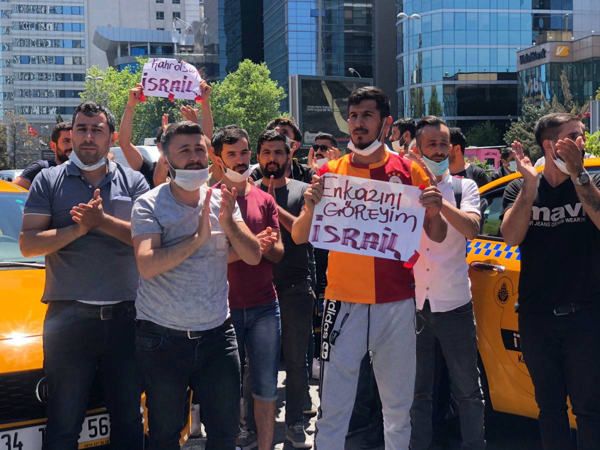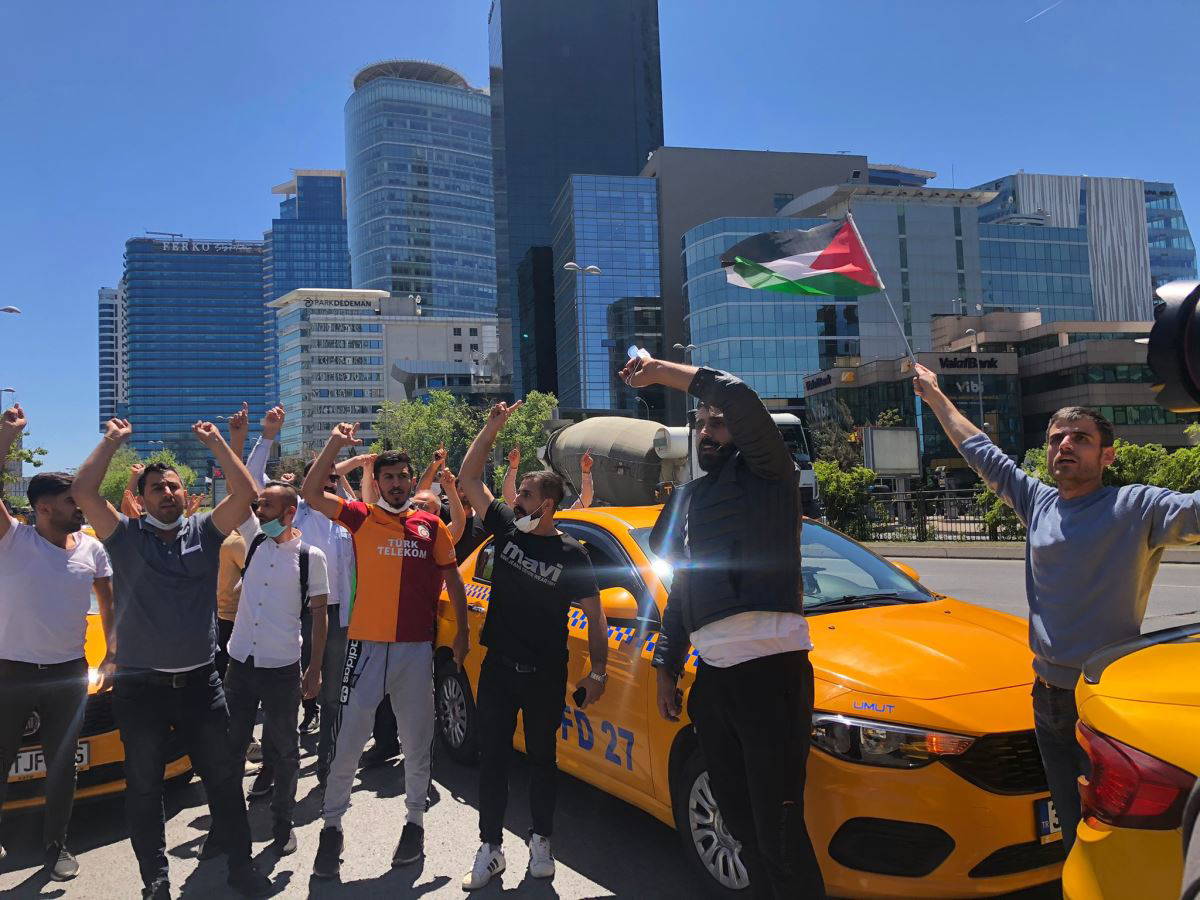 'Kahrolsun İsrail', "Enkazını göreyim" dövizleri taşıyan taksiciler, kornalar ve bayraklarla slogan attı. Polisin geniş güvenlik önlemleri aldığı eylemin ardından gelen grup olaysız dağıldı.