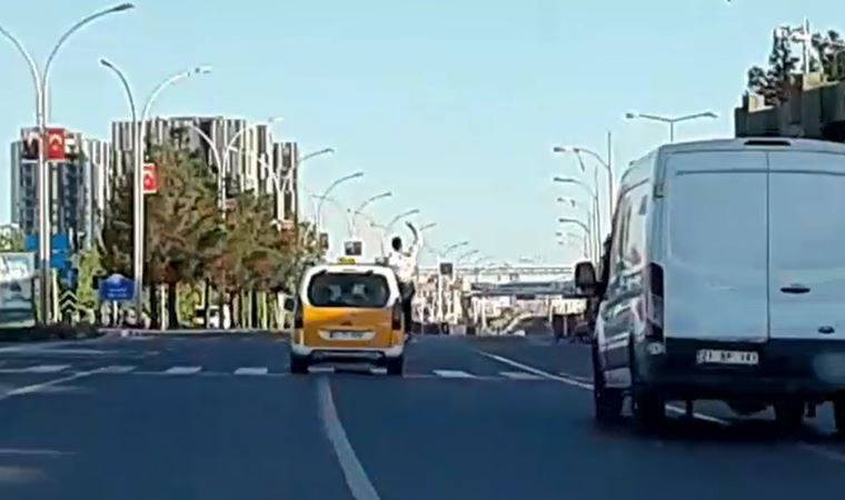 Diyarbakır- Elazığ yolunda, önceki gün sabah saatlerinde, 21 TT 1039 plakalı taksinin camından kendisini sarkıtarak, tehlikeli hareketler yapan yolcu, cep telefonu kamerasıyla görüntülendi.