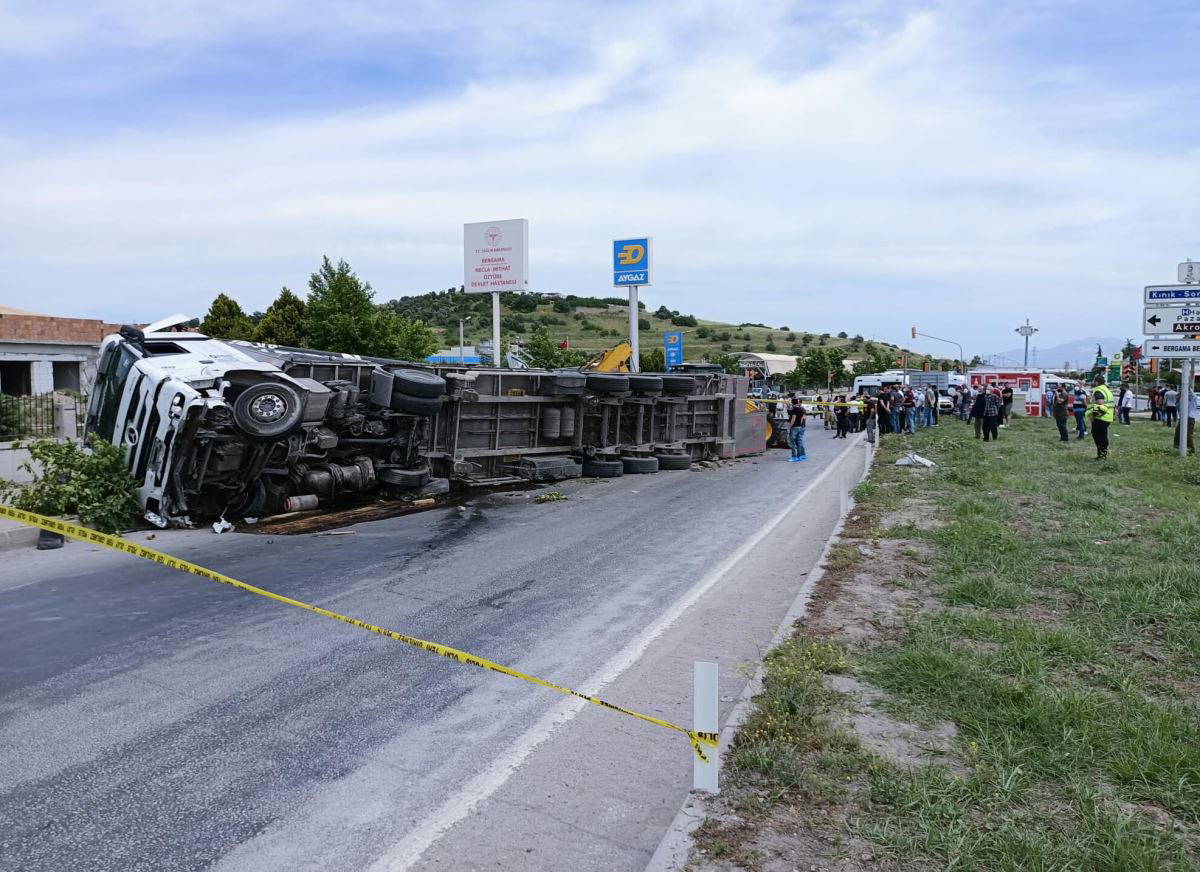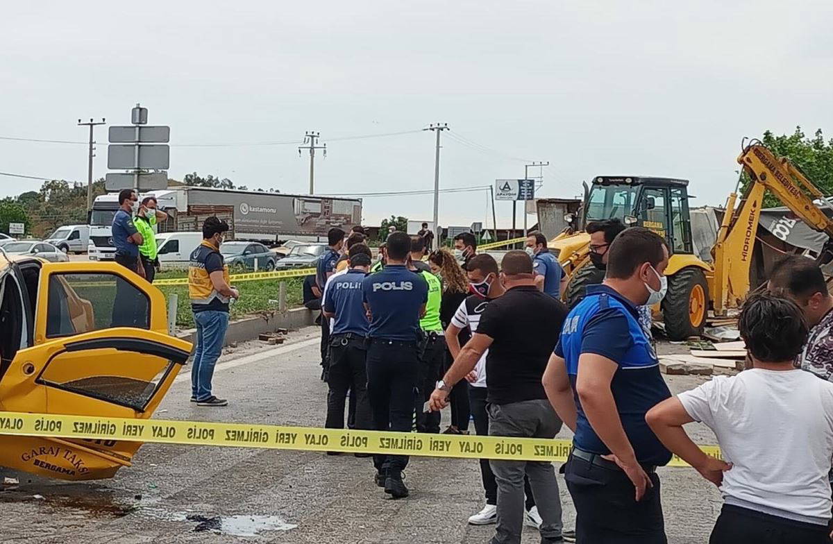 Kınık'tan Bergama yönüne giden Murat Soydan yönetimindeki TIR, kavşakta kırmızı ışıkta geçtiği ileri sürülen Ramazan Çınar yönetimindeki 35 AH 010 plakalı taksiye çarptı. Savrulan sunta yüklü TIR, hastaneye gitmek için kaldırımda yürüyen Özgür Aydemir (40) ile yanındaki arkadaşı Erol Yılmaz'ın (43) üzerine devrildi.