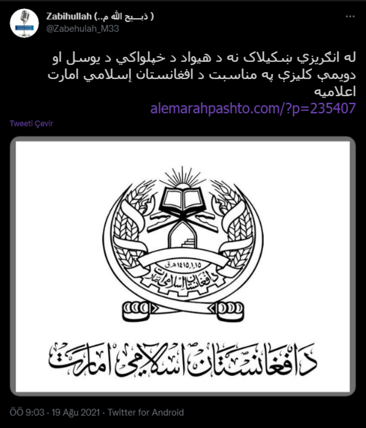 Taliban Twitter üzerinden yaptığı açıklamada, Afganistan'ın artık bir "İslam Emirliği" olarak yönetileceğini açıkladı. Böylelikle Taliban, 4 Ağustos'ta bir İslam Emirliği'nin "restorasyonunu" desteklemediğini belirten Birleşmiş Milletler Güvenlik Konseyi'ne (UNSC) doğrudan meydan okumuş oldu.
