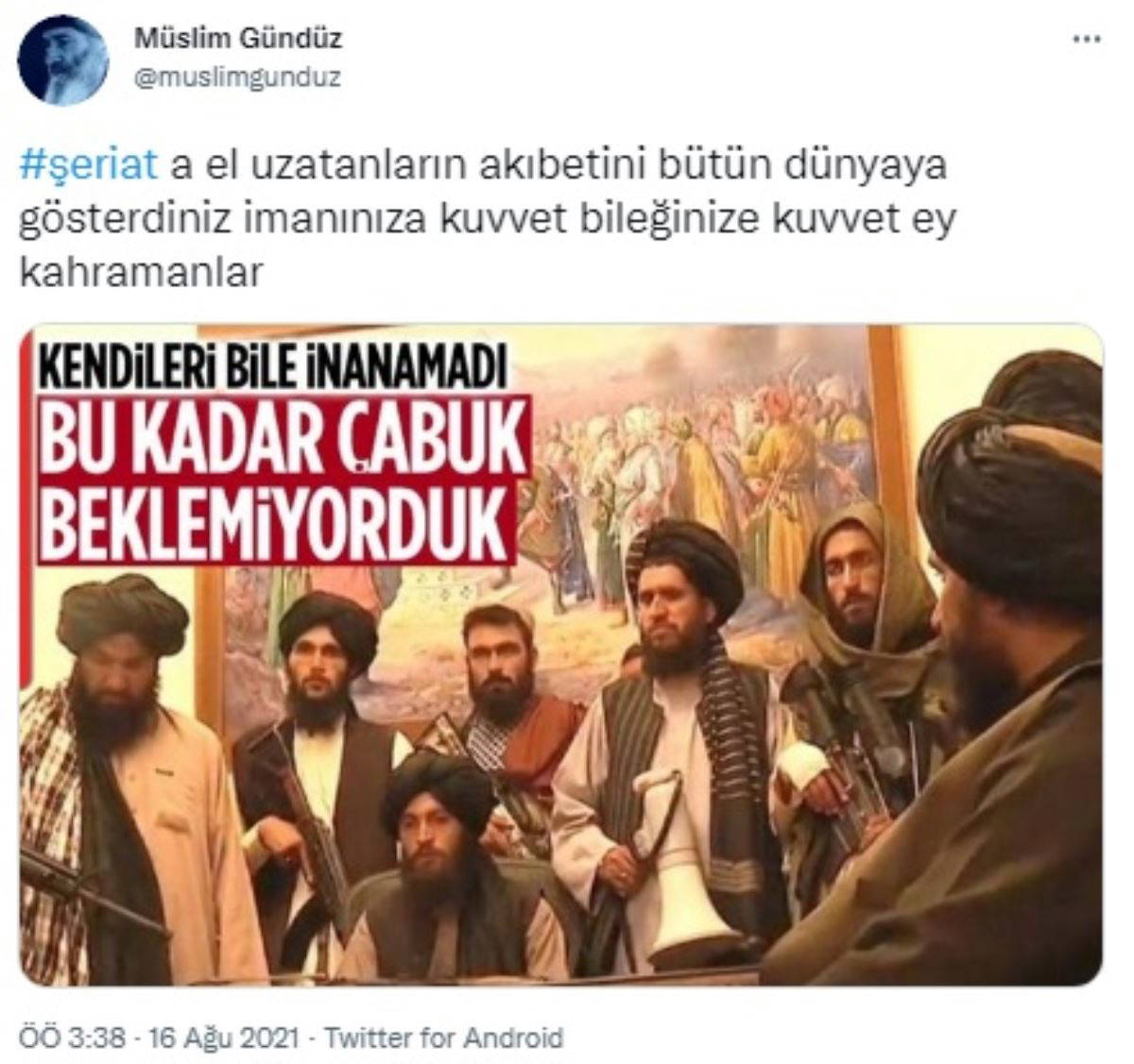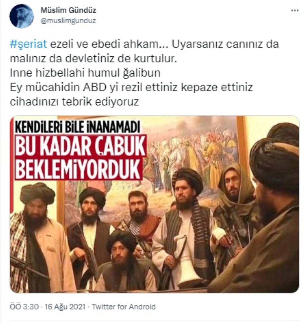 Gündüz, silahlı Taliban militanlarının Cumhurbaşkanlığı Sarayı'ndan fotoğraflarını Twitter hesabından paylaşıp "Şeriat a el uzatanların akıbetini bütün dünyaya gösterdiniz imanınıza kuvvet bileğinize kuvvet ey kahramanlar", "Şeriat ezeli ve ebedi ahkam... Uyarsanız canınız da malınız da devletiniz de kurtulur. Inne hizbellahi humul ğalibun Ey mücahidin ABD yi rezil ettiniz kepaze ettiniz cihadınızı tebrik ediyoruz" ifadelerini kullandı.