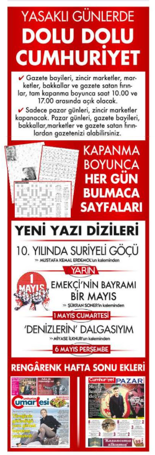 Koronavirüs ile mücadelede 29 Nisan Perşembe günü saat 19.00'da başlayıp, 17 Mayıs Pazartesi saat 05.00'e kadar sürecek tam kapanma uygulamasında Cumhuriyet'e, ulaşabileceksiniz.