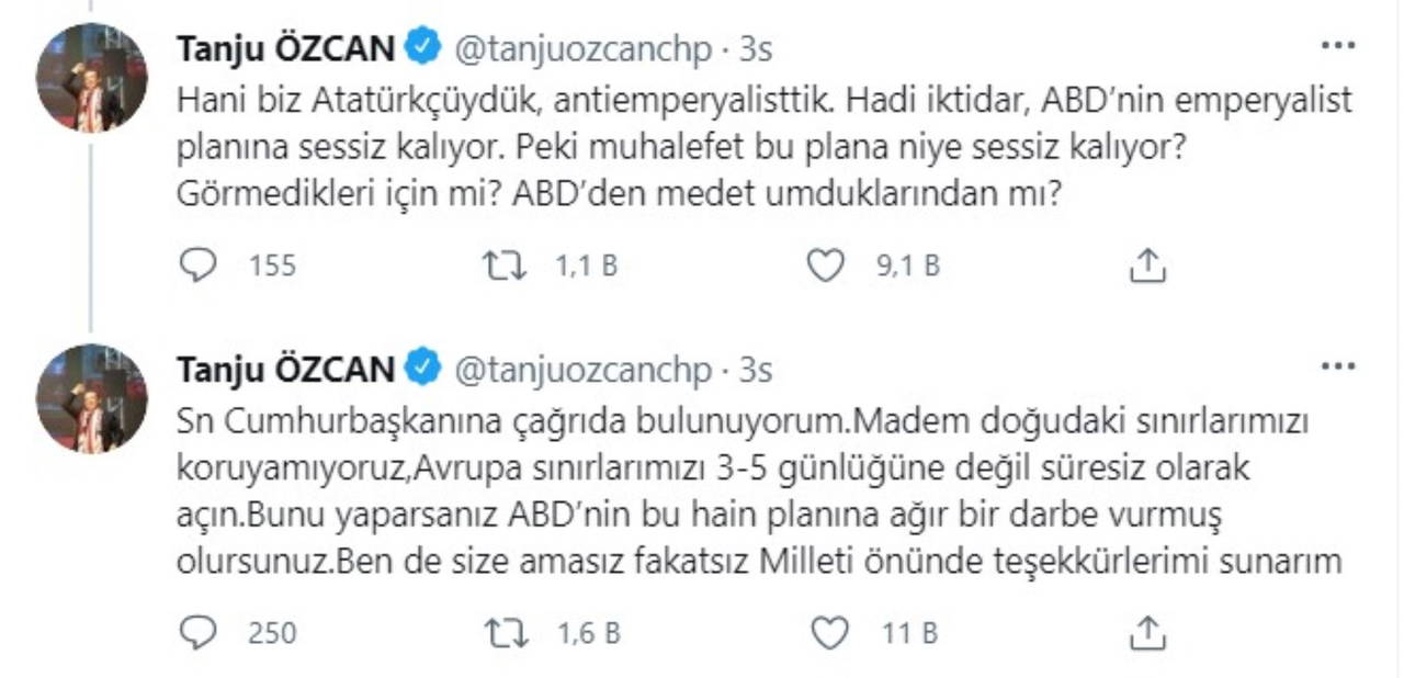 Sayın Cumhurbaşkanı'na çağrıda bulunuyorum. Madem doğudaki sınırlarımızı koruyamıyoruz, Avrupa sınırlarımızı 3-5 günlüğüne değil süresiz olarak açın. Bunu yaparsanız ABD’nin bu hain planına ağır bir darbe vurmuş olursunuz. Ben de size amasız fakatsız milleti önünde teşekkürlerimi sunarım."