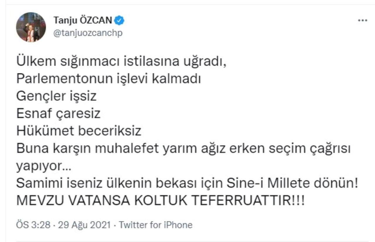 "Ülkem sığınmacı istilasına uğradı, parlementonun işlevi kalmad, gençler işsiz, esnaf çaresiz, hükümet beceriksiz. Buna karşın muhalefet yarım ağız erken seçim çağrısı yapıyor… Samimi iseniz ülkenin bekası için sine-i millete dönün! Mevzu vatansa koltuk teferruattır."