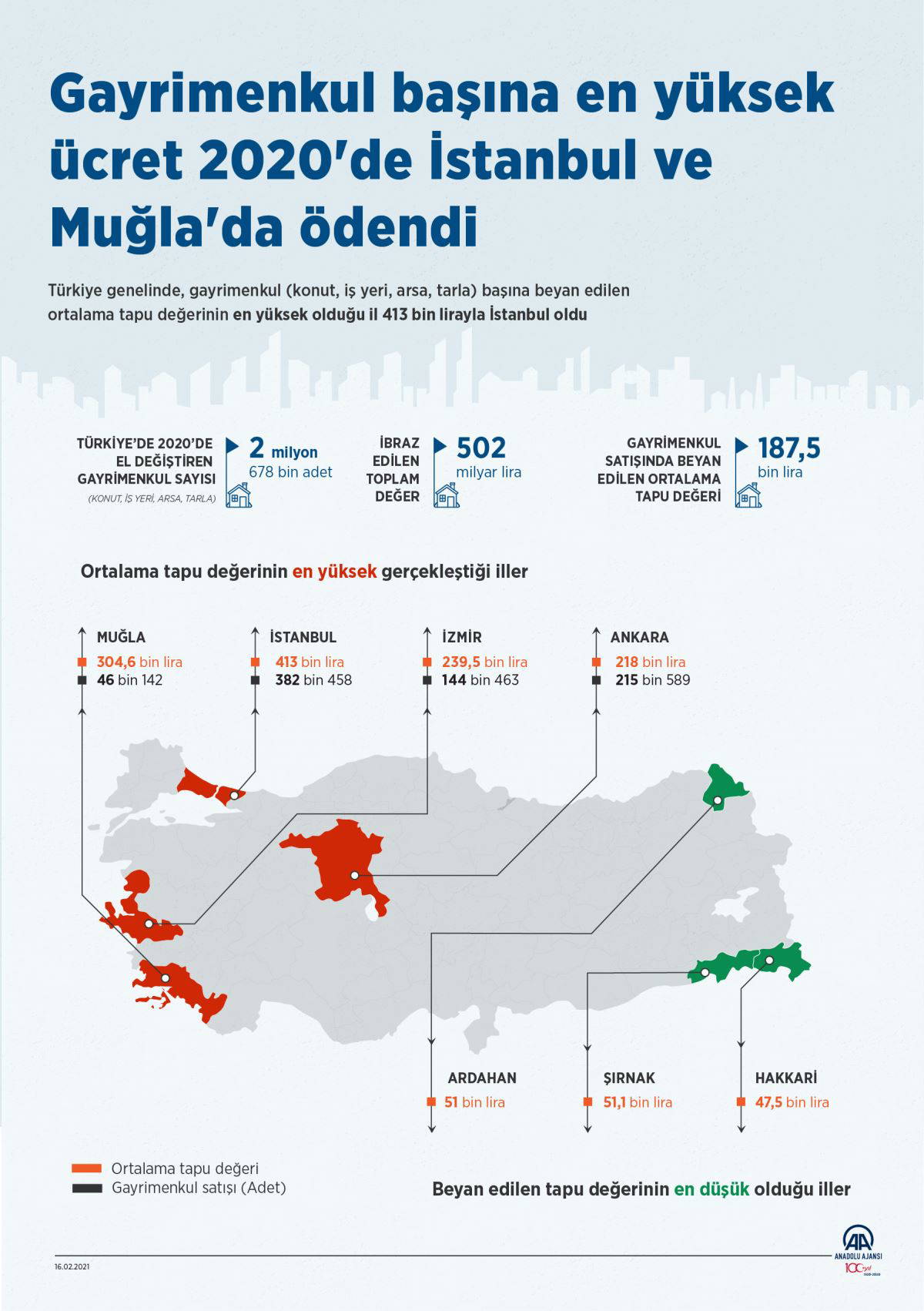 Geçen yıl ülke genelinde 2 milyon 678 bin adet gayrimenkul (konut, iş yeri, arsa, tarla) el değiştirirken, bu satışlarda 502 milyar liralık değer ibraz edildi. Tapu başına beyan edilen ortalama değer 187,5 bin lira olarak gerçekleşti.
