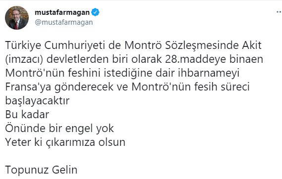 AKP'ye yakın Albayrak Medya grubunun dergilerinden Derin Tarih'in kısa süre öncesine kadar Genel Yayın Yönetmenliğini yapan Mustafa Armağan, Twitter hesabından "Montrö'nün nasıl feshedilebileceğini" açıkladı.