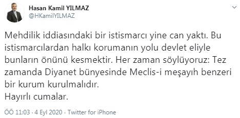 "Mehdilik iddiasındaki bir istismarcı yine can yaktı. Bu istismarcılardan halkı korumanın yolu devlet eliyle bunların önünü kesmektir. Her zaman söylüyoruz: Tez zamanda Diyanet bünyesinde Meclis-i meşayıh benzeri bir kurum kurulmalıdır.