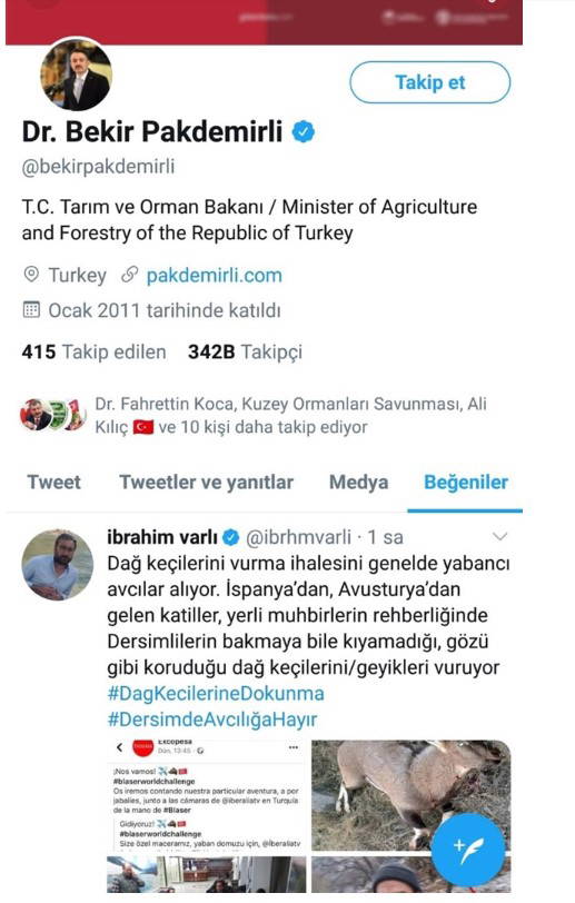 Bakan Pakdemirli’nin konuyla ilgili olarak BirGün Yayın Koordinatörü İbrahim Varlı’nın sosyal medya hesabından paylaştığı ve “Dağ keçilerini vurma ihalesini genelde yabancı avcılar alıyor. İspanya’dan, Avusturya’dan gelen katiller, yerli muhbirlerin rehberliğinde Tunceli halkının bakmaya bile kıyamadığı, gözü gibi koruduğu dağ keçilerini/geyikleri vuruyor” ifadelerinin yer aldığı ve Tarım ve Orman Bakanlığı bilgisi dahilinde açılan ihaleye yönelik eleştiriyi beğenmesi ise dikkat çekti.